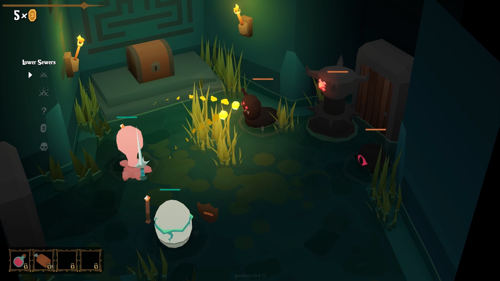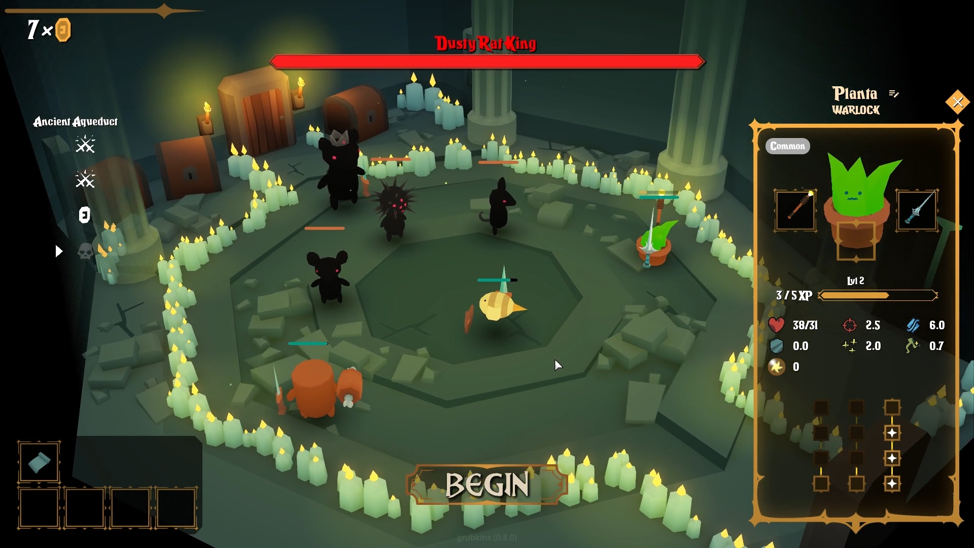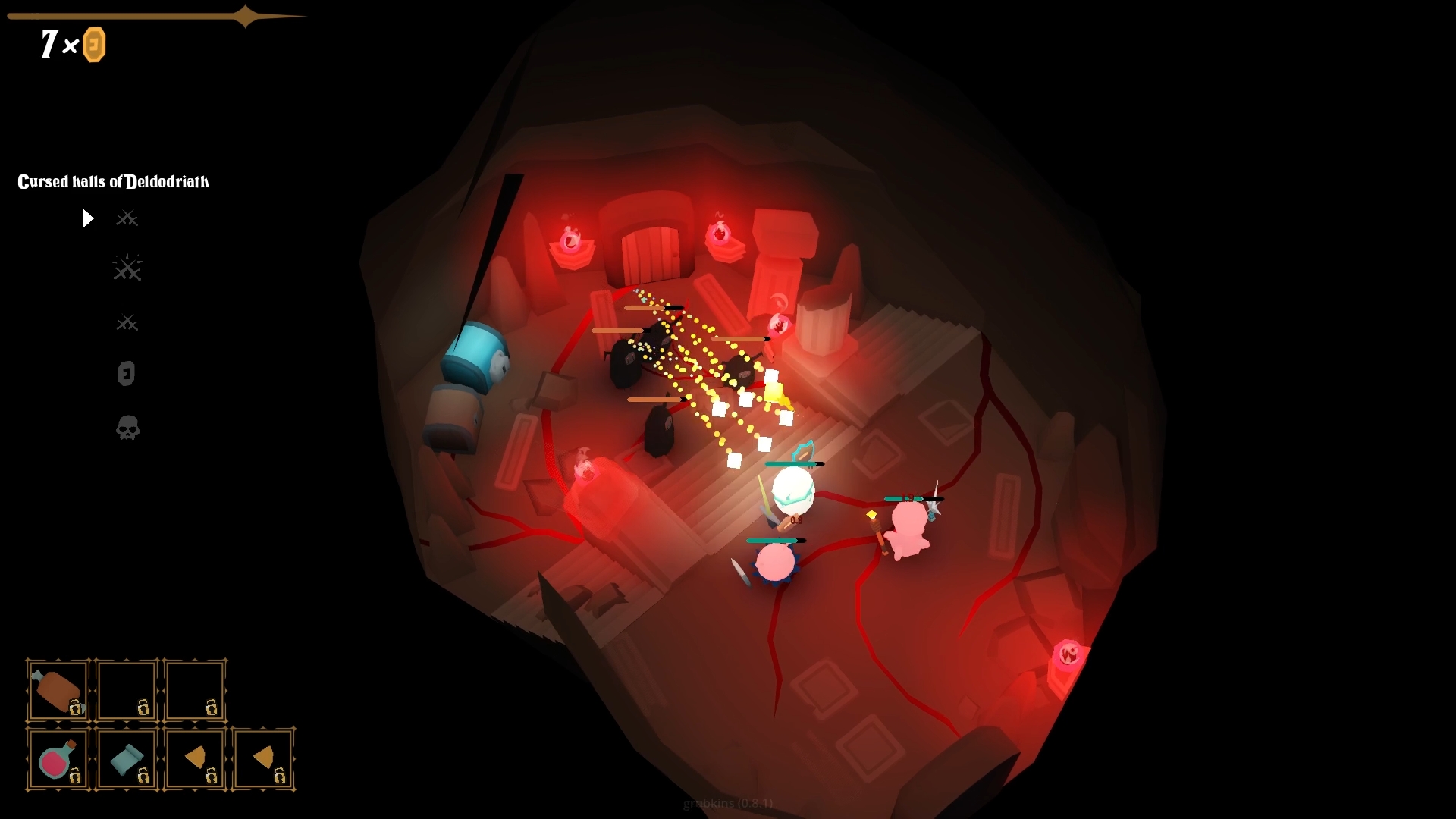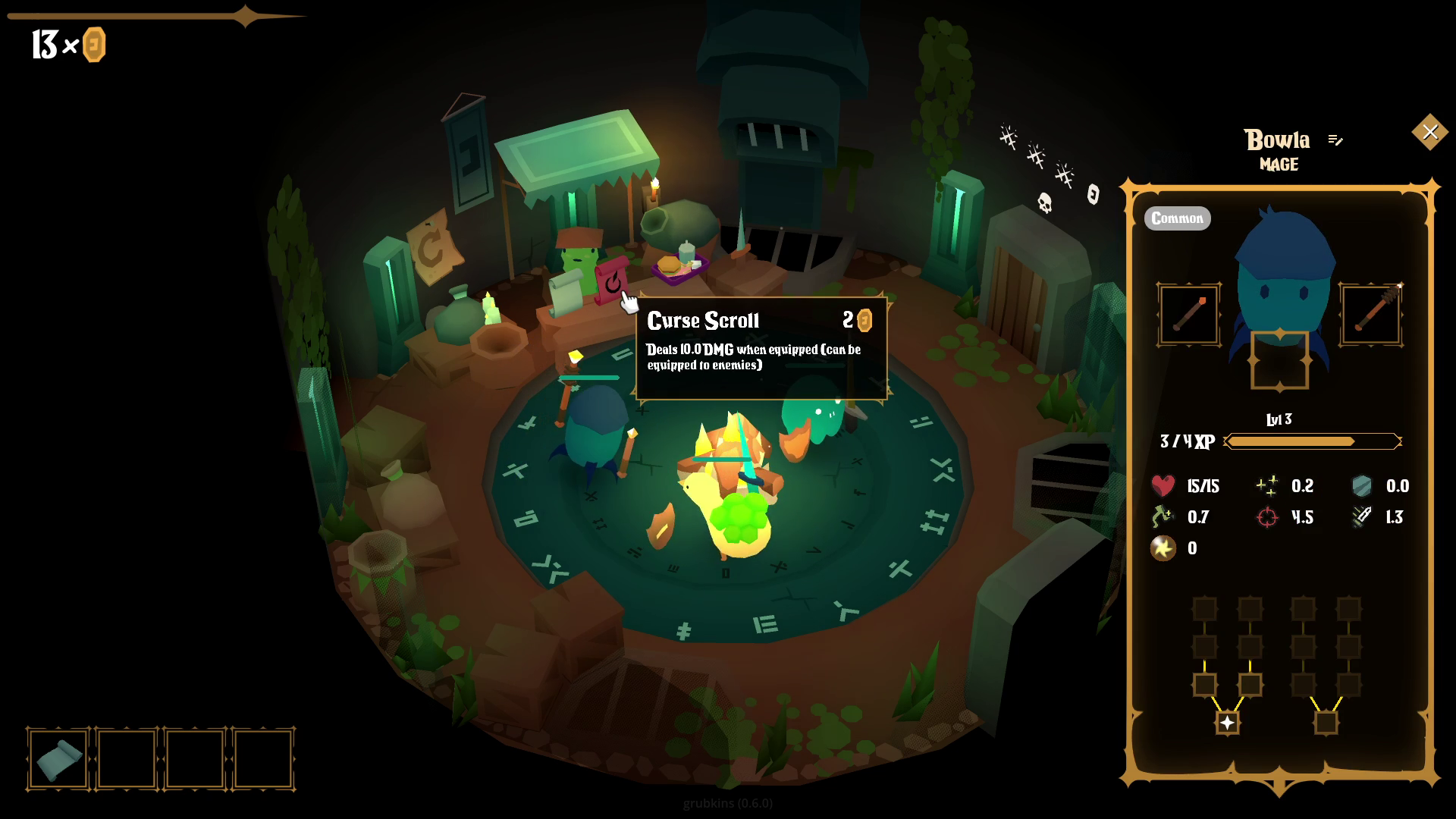 When you finish preparing, your grubkins will battle the enemies of this cursed dungeon. Each fight is physically driven and the forces of combat can drastically change the outcome. Swords clash, spells unleashed, potions consumed… If at least one grubkin is left standing, you have a chance of reaching the bottom.